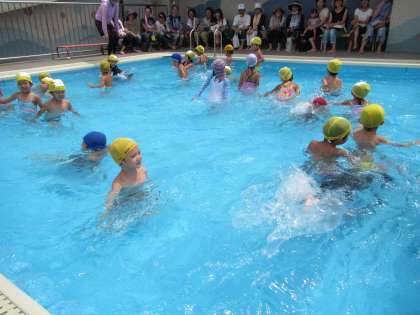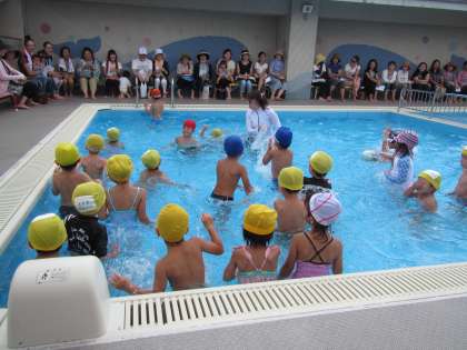 大きなプールに入って遊ぶことが楽しくなり、みんなでグルグルプールの中を歩いて水の流れを楽しんだり、宝物ひろいの遊びをしたりしている様子を見ていただきました。