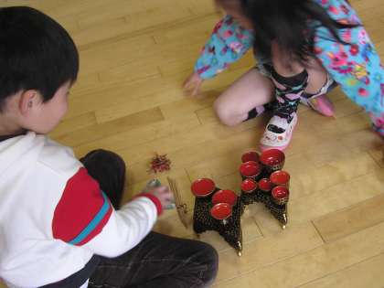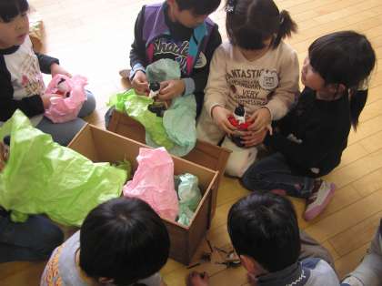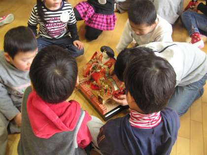 箱から出しながら,自然に子どもたちは「うれしいひなまつり」の歌をくちずさんでいました。最後はみんなで飾り付けのすんだひな壇の前に座って,「灯りをつけましょ,ぼんぼりに〜♪」と大合唱でした。