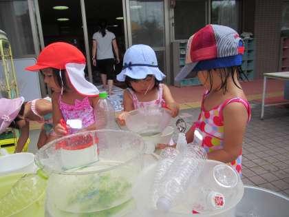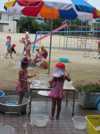 今日は、園庭で水遊びをしました。
