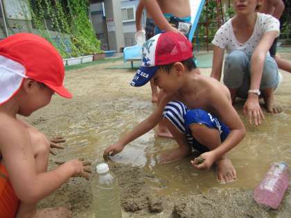 色水をつくったり、水を掛け合ったり、水たまりにできた泥で遊んだりしました。
