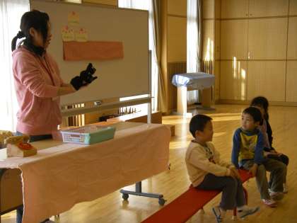 今日は黒ねこのケーキ屋さんが,美味しいケーキでお友達を紹介し,お祝いしてくれました。みかんのケーキやイチゴのケーキ,抹茶のケーキ,チョコレートケーキなど美味しいケーキが並びました。2月生まれのお友達は8人。1月にお休みだったお友達1人とあわせて9人のお友達のお祝いをしました。