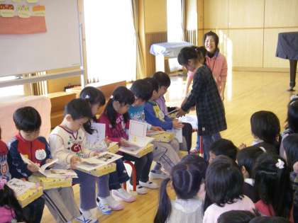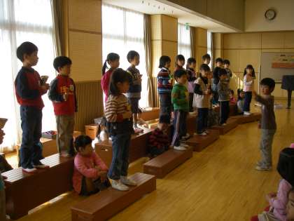 お祝いをした後には,ゆり組の子どもたちが,生活発表会で発表した合奏を他の学年の子どもたちは全部聴いてなかったので,誕生会の機会に聴かせもらうことにしました。