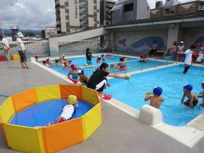 子どもたちは、水の中で、おもちゃで遊んだり、水の流れを楽しんだり、のびのびと体を伸ばして浮力を感じたり、様々に遊んでいます。