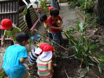 4歳児の男の子たちが虫を探しながら、その根っこを掘っていました。