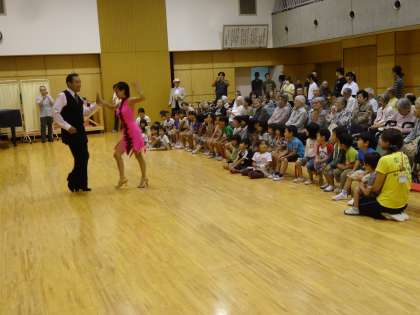 預かり保育に参加した子どもたちは特養のおじいさん・おばあさんと一緒に社交ダンスを見せていただきました。