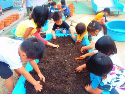 みんなが混ぜてつくった土です。きっと、二十日大根の種もすくすくと育つことでしょう。