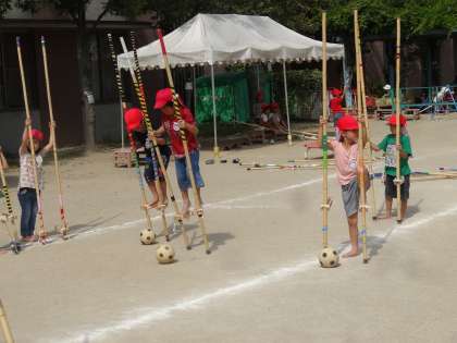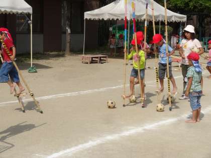 写真は竹馬でボールを蹴る“竹馬サッカー”です。