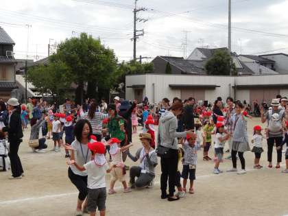 園庭に集まった親子が手をつないで回ったり、手をぱんぱんと打ち鳴らしたりして親子で一緒に踊る姿は幸せそのものですね。