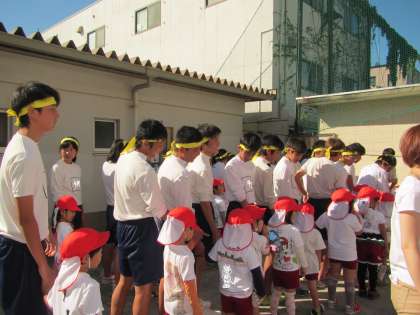 (中学生には事前に幼稚園から体操のやり方を伝えるなどの交流もしています。)
