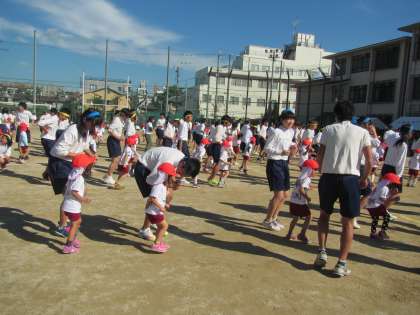 開会式の後、中学3年生と手をつないで入場し、体操「よーい どん」をしました。