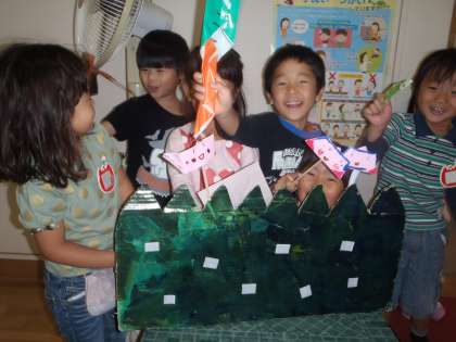 折り紙でペープサートをつくり,人形劇の始まりです。