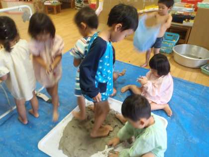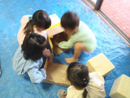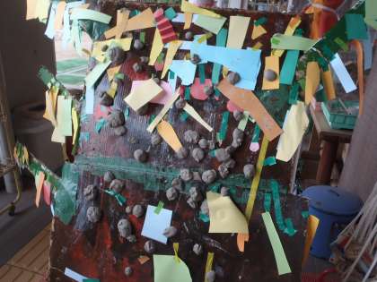 そばにあった段ボールの“木”にAちゃんが粘土を付けました。