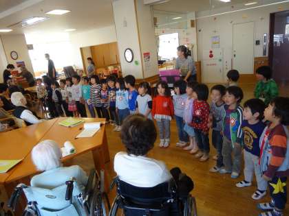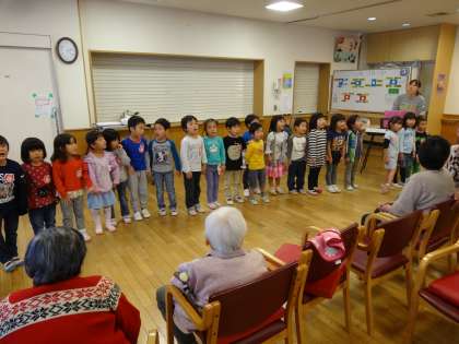 4歳児ばら組の子どもたちがお隣の特別養護老人ホームへ歌を歌いに行きました。