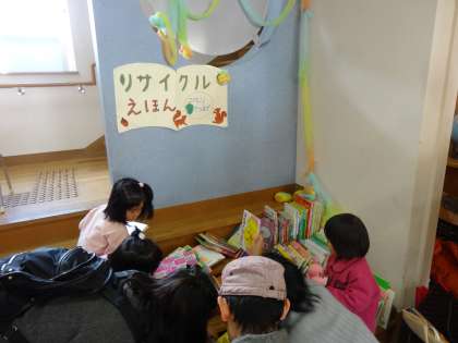 バザー会場のそばでは、子どもたちが楽しめる遊びのコーナーや、リサイクル絵本のコーナーもあります。