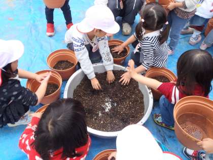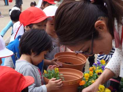 自分の植木鉢に,チューリップの球根とビオラの花を