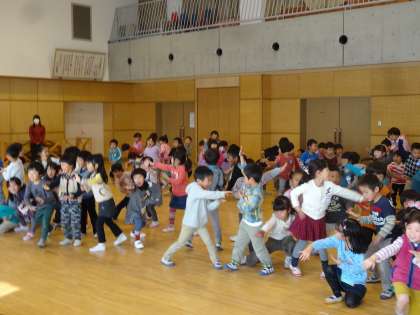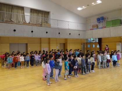 上京区にある公立幼稚園5園の年長児が集まって、一緒に歌を歌ったり、踊りを踊ったりして交流しました。