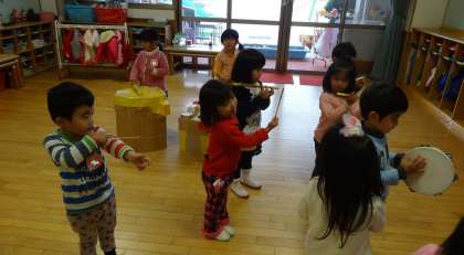 3歳児が思い思いの楽器を持って、先生のピアノを聞きながら楽器を鳴らしています。