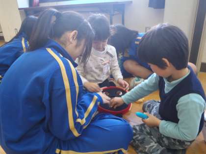初めはお互いに表情だけでなく、身体も硬く、緊張感が漂っていました。が、中学生のお兄さん、お姉さんが膝を曲げ、園児の目の高さになって話しかけたり、「これであそぶ?」と声をかけたりしてくださり、子どもたちも気持ちがほぐれていきました。