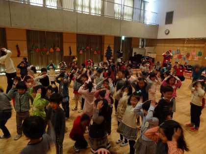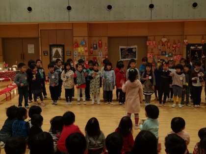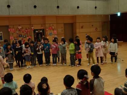 5歳児の楽器遊び「星に願いを」を聞いたり、みんなで「サンタクロースはいそがしい」という遊びをしたりしました。
