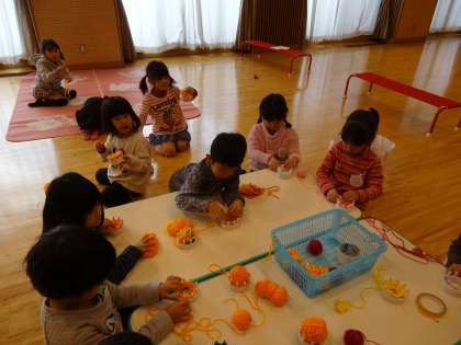毛糸をのせて下の糸を引っ張り上げて棒にかけて・・・