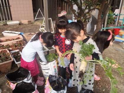 幼稚園で袋栽培している大根を収穫しました。