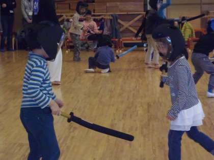 2月28日(土),みつば会楽しい集いが開催されました。みつば会の大きな行事の一つです。在園児・未就園児・小学生の子どもたちと保護者の皆さんと共にスポーツチャンバラを楽しみました。「スポーツチャンバラ協会」の4名の講師の先生から,礼儀作法や楽しく遊ぶためのルールを教えていただました。ストレッチが終わると,まず,個人で楽しみます。後半は,4グループに分かれ,グループ名やリーダーを決めました。小学生がリードし,話し合っていました。そのような姿は,みつば会ならではの,異年齢の子どもたちが触れ合う良い場となりました。もちろん,小学生がリーダーになり,グループごとの試合が始まります。応援の声も高まり,会場の雰囲気は,大いに盛り上がりました。最後は,保護者や先生もスポーツチャンバラを経験し,とっても,晴れやかな気持ちになりました。楽しい集いの開催に向け,応援してくださるみつば会の皆様,教えていただいた講師の皆様,ありがとうございました。子どもたちがすくすく育っていくのを,これからも,見守ってください。