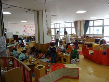 2クラスの間にある壁(パーテーション)をあけて、ひとつの保育室にしました。