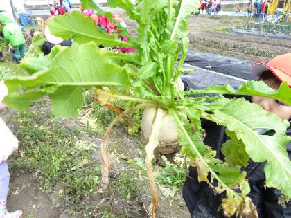 4歳児は以前植えたえんどう豆や玉ねぎに水をやったり、地域の方々の畝のカブを抜くなどのお手伝いをしました。