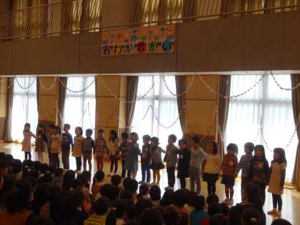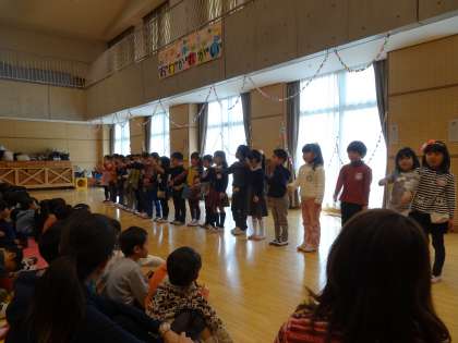3・4歳児の保護者のみなさんが遊戯室にかわいい飾りをつけてくださり、お別れ会が始まりました。