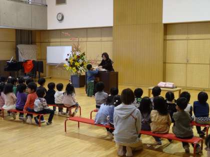 3歳児・4歳児の子どもたちが園長先生から進級の記念品をいただきました。