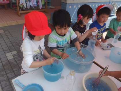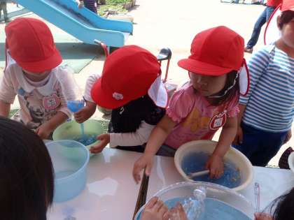 部屋の前に,水遊びができるように水を入れた透明の容器や