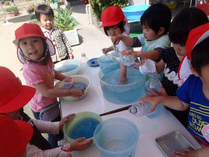 ペットボトルにカップ容器で水を入れたり,透明容器に