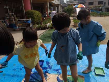 暑いくらいの陽ざしが降りそそぎ,とっても開放的な環境の中で,子どもたちはも足や手にも絵の具をつけて楽しみました。