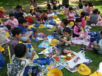いろいろな所で遊んでいるうちに,自然と4・5歳児が混じりあって遊んでいる姿が見られ,楽しいひと時を過ごすことができました。外で食べるお弁当もおいしかったね。また一緒に行こうね!