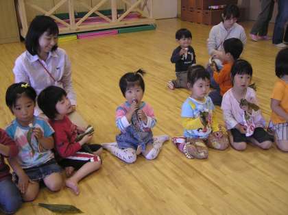 みんなで,こいのぼりの歌を歌ったり,子どもの日ことや柏餅,ちまきのお話を聞いたりした後,ゆうぎ室でみんなで輪になって,ちまきを食べました。