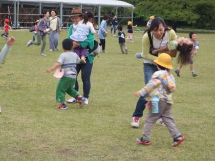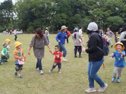 植物園に着いてからは,4・5歳の子どもたちはおうちの方と一緒に広い芝生でしっぽとりをしました。