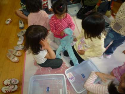3歳の子どもたち一人に、ゆり組が一人以上かかわっていたので、はじめはゆり組の子どもたちも戸惑う様子が見られていました。