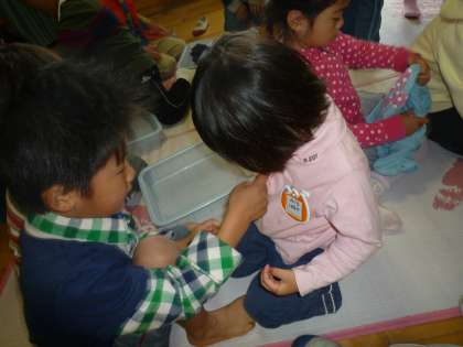 少しずつ、「靴下から脱ぐんだよ。」「ボタン、外せる?」「自分で脱げるんだね!すごいね!」など、自分たちよりも小さい友達に対して声をかけ、手を貸してあげ始めました。