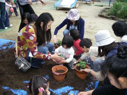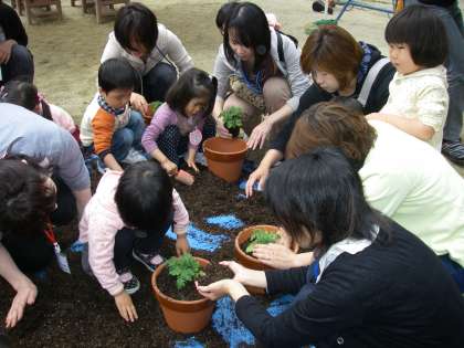 3歳児たんぽぽ組ともも組は,お家の人と一緒にミニトマトの苗を植えました。