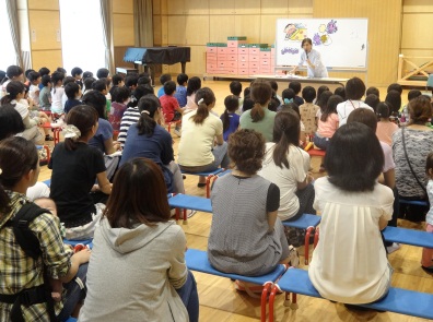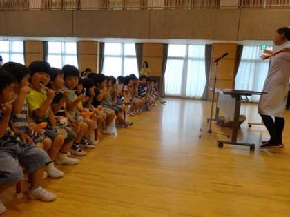 子どもたちは持参の歯ブラシで歯科衛生士の先生に歯の磨き方を教えてもらいながら,みんなで「シュッシュッ!」と歯を磨くおけいこをしましたよ。
