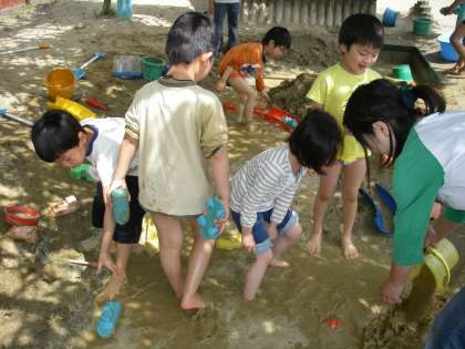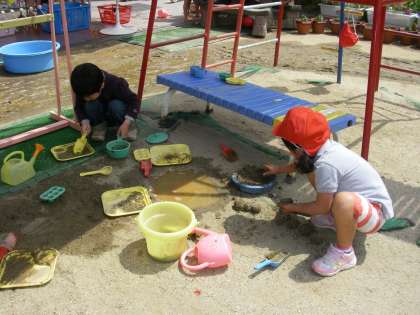 砂場では,どうしたらいっぱいのお水の川や池ができるのだろうと考えながら水を運んだり,流したりしています。