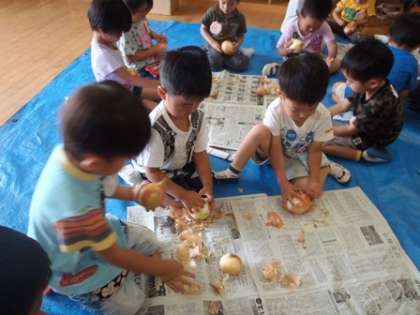 3歳児は玉ねぎの皮をむき、