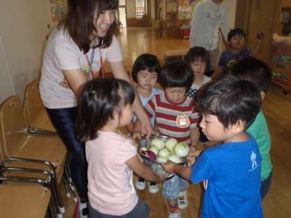 皮をむいた玉ねぎがピカピカに光っていることに気が付き、嬉しそうに先生に見せています。