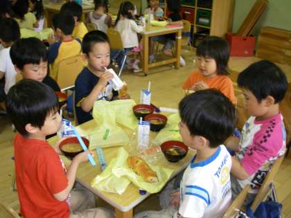 さあ,パンランチの時間になりました。「あったータマネギ」「あまいわ」という声が聞こえてきました。タマネギの入ったおいしい今日のお味噌汁でした。