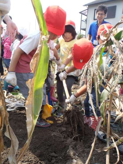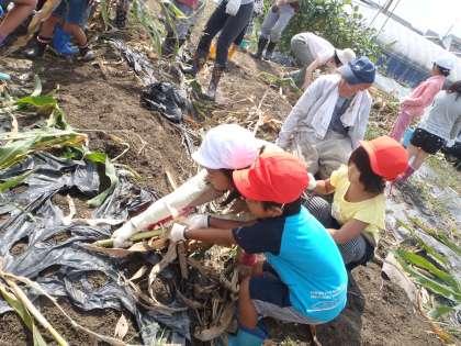 今日は,新町小学校の1年生と一緒に畑にポップコーンを収穫に行きました。