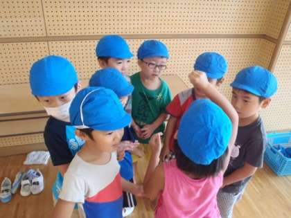 帽子をねらって存分に走り回り、友達に自分の考えた作戦を伝えています。
