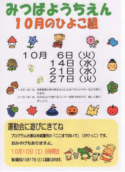 9月29日には,ひよこ組さんのミニうんどうかいと幼稚園説明会がありますよ。ぜひ来てくださいね!