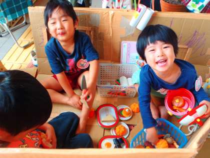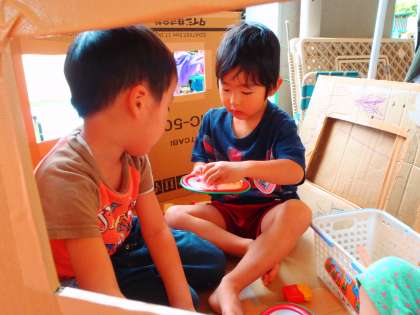 部屋の前に置いていたおうちで,”おうちごっこ”がはじまりました。