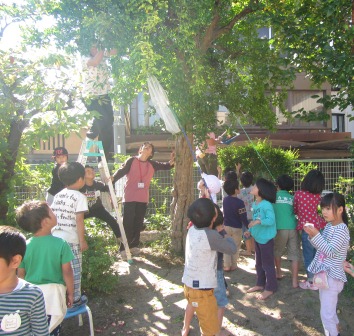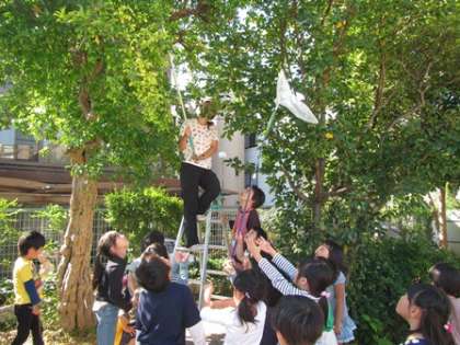 幼稚園の庭で子どもたちが上を見上げています。