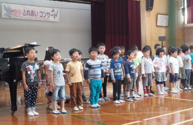 上京中学校で行われたふれあいコンサートに、みつば幼稚園のゆり組と京極幼稚園のことり組・はな組の子どもたちが一緒に参加しました。